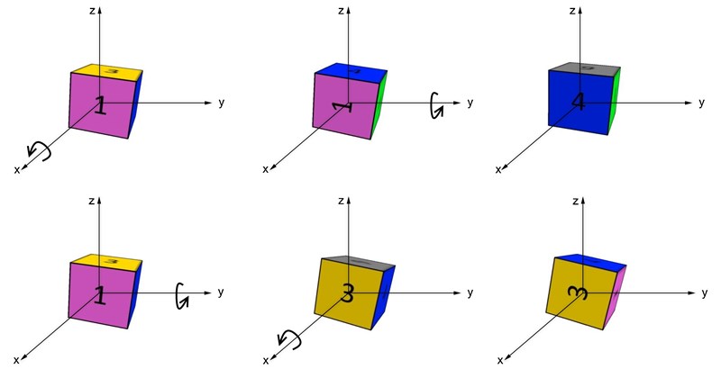 I den första raden roterar vi först 90° moturs runt x-axeln och sedan 90° moturs runt y-axeln. Det motsvarar . I den andra raden gör vi tvärtom, först roterar vi 90° moturs runt y-axeln och sedan roterar vi 90° moturs runt x-axeln. Det motsvarar