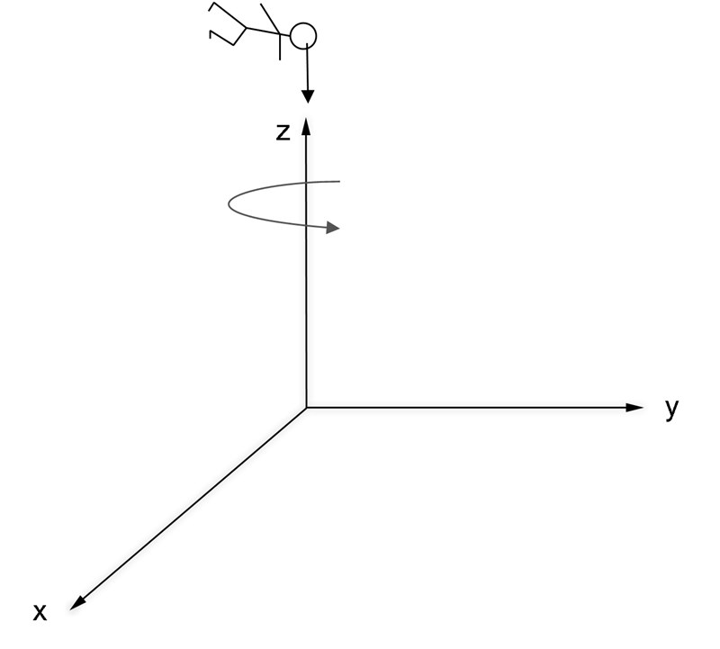 En moturs rotation kring z-axeln innebär i ett högerorienterat rektangulärt koordinatsystem med ordning (xyz) att man vrider med ökande vinkel från x-axeln mot y-axeln. Man ställer sig alltså i spetsen av basvektorn och tittar ned mot planet de andra basvektorerna bildar. Motsvarande de andra axlarna.