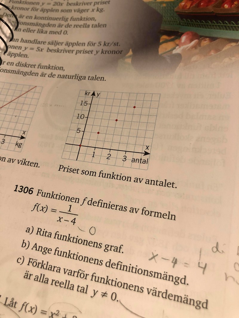 På b) så får det vara vilka x som helst men inte 4 då det blir noll i nämnaren.