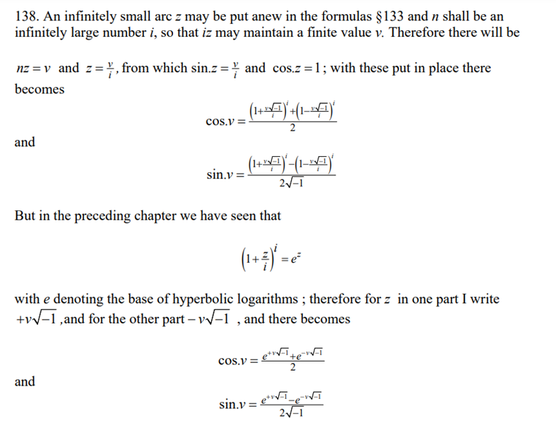 Låt oss återgå till frågan: Varför bytte Euler ut dessa trigonometriska funktioner mot variabler? Det verkar som att gränsvärdesbegreppet inte existerade på Eulers tid. Beskrev han i som ett oändligt tal istället för ?