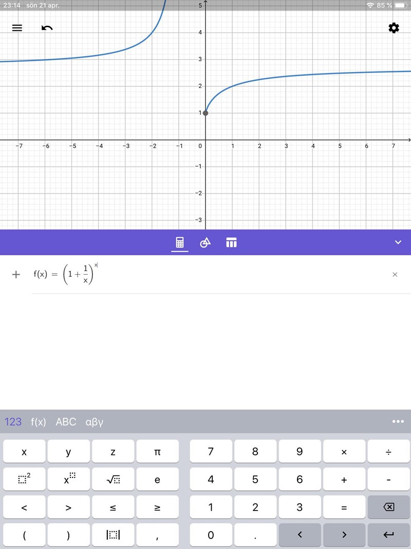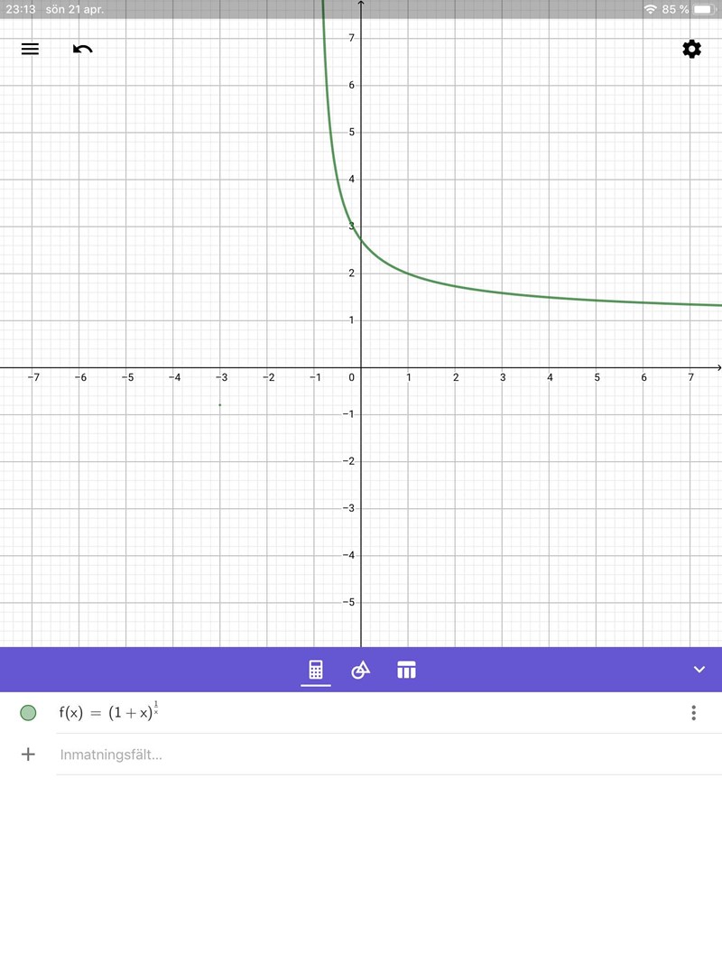 f(x)= (1+x)^(1/x ). x>-1. Men jag har gjort en tabell om x=-3 bli (-2)^(-1/3)= 1/(-2)^(1/3) och det är ingen problem .jag kommer fram Att x inte bli noll och negitva jämna tal -2,-4,••men varför grafen ser det inte ut