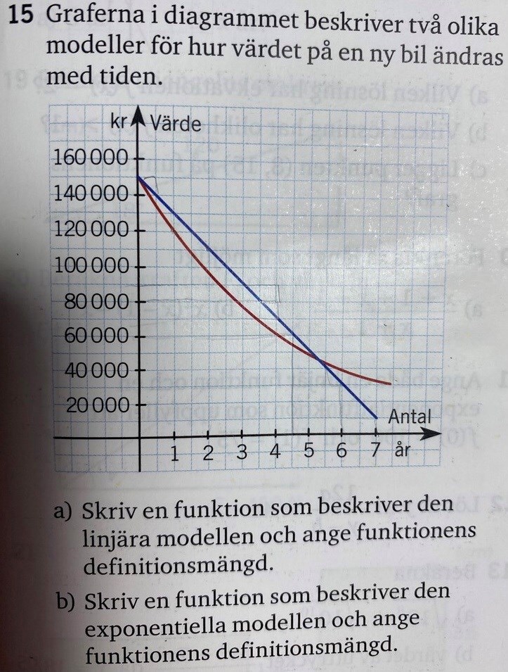 Har lite problem med att ange definitionsmängden på b uppgiften. Jag fick funktionen: f(x) = 150 000 * 0,795^x