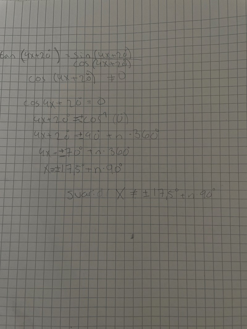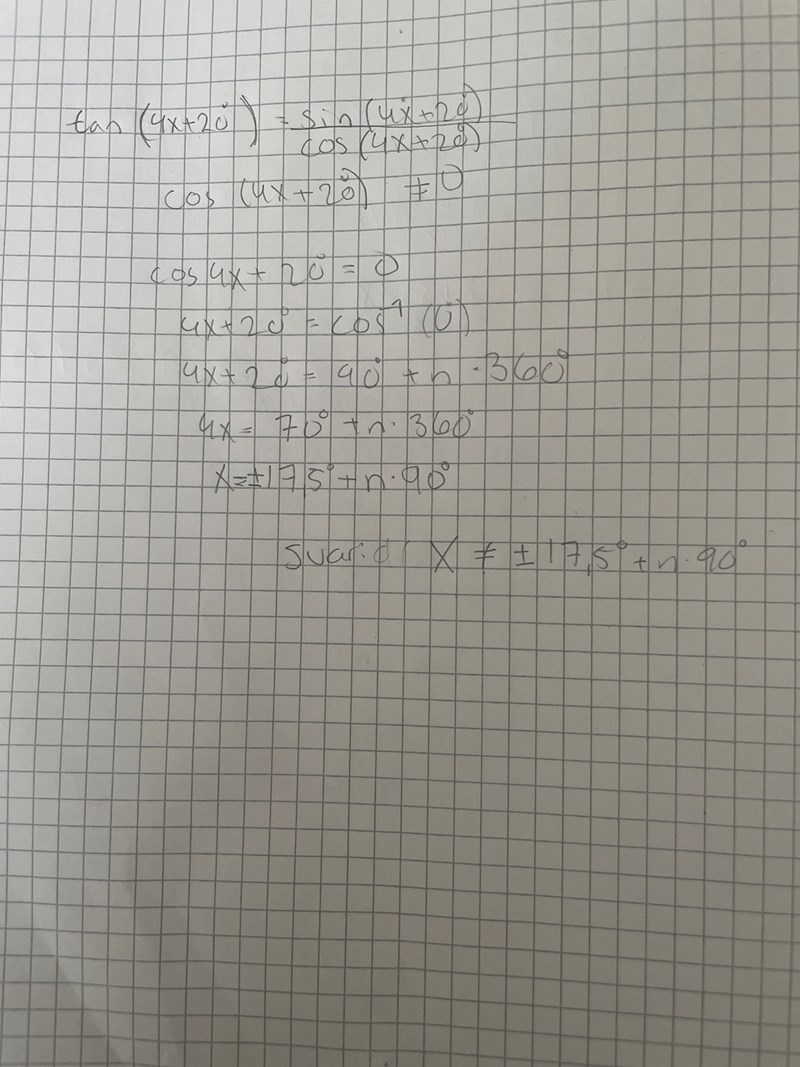 - 4x+20° = 90°+n•360°, vilket ger dig x = 17,5°+n•90°