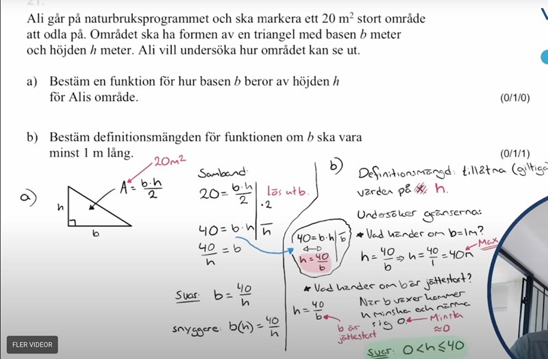 Inom denna frågan undrar jag på fråga b) varför man ska få veta värdet av h. För definitionsmängden beskriver att giltiga värden av x och x är ju liksom basen som står för basen av triangeln i denna frågan