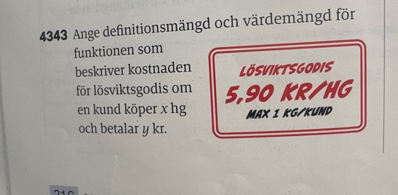jag tänkte att både definitionsmängden och värdemängden bara behöver vara större än eller lika med 0, men facit har ett helt intervall, där definitionsmängden tex är mellan 0 och 10 men var får de 10 ifrån? Det står inte att det finns någon begränsning för mängden godis man köper.