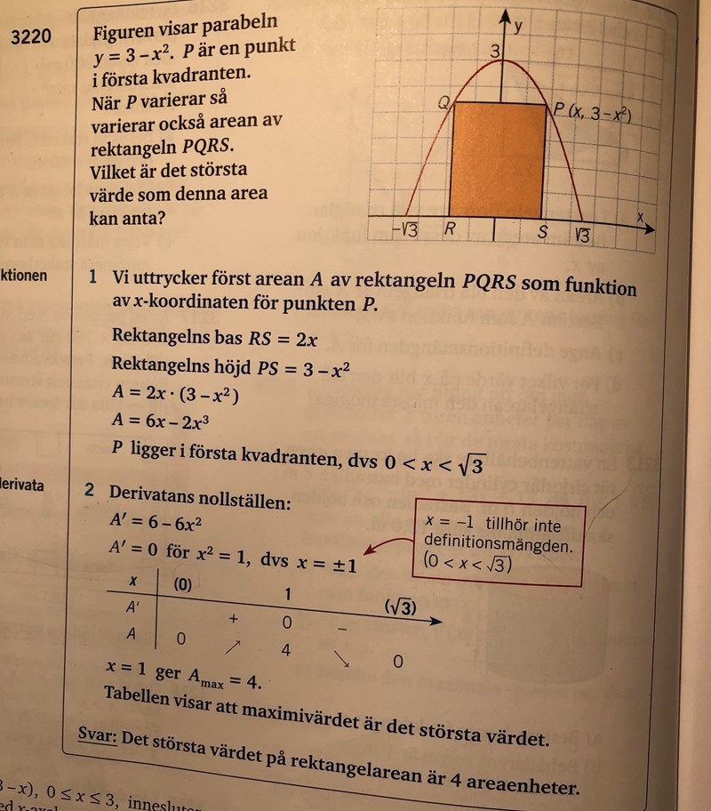 Det står att P skall ligga i första kvadranten, så x > 0 i uttrycket för arean.