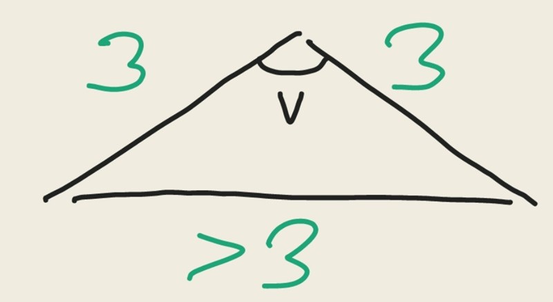 Det är större än 3, om den tredje sidan är 3cm får du en likbent triangle med "top vinkel" 60grader. Du kan öka på gradtalet och därmed få en längre bas.
