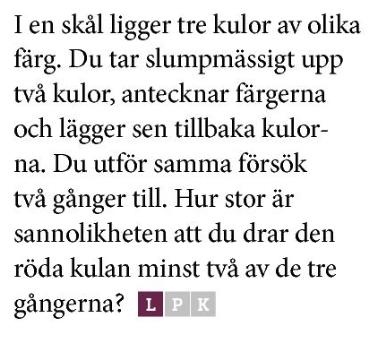 För att få svar på hur stor sannolikheten är att man drar den röda kulan minst två av de tre gångerna ska jag bara addera: 4/27+ 2/27+ 4/27 = 12/27?