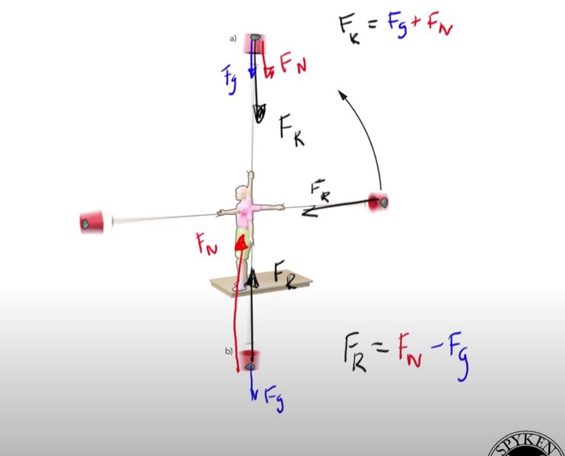 Jag förstår här att Fn är riktad neråt för att hinken hindrar bollen från att gå upp, och att Fres är riktad neråt för att rörelsens centrum är riktad neråt, och att Fg är riktad neråt på grund av graviationen. Men det jag inte förstår är att: