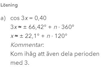 Kom ihåg att det står cos3x. Det innebär att perioden nu går 3 gånger snabbare (upprepas redan vid 120 grader)