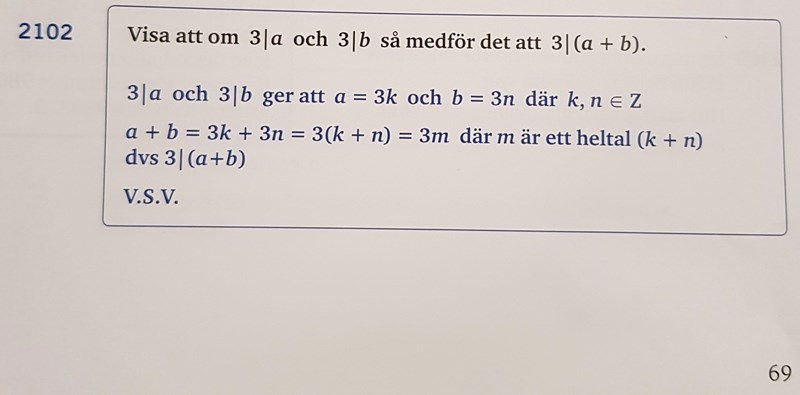 Att 3 delar a är samma sak som att det finns ett heltal k sådant att 3k = a. Det är mer eller mindre definitionen på "delar". Man skriver 3|a för att det direkt motsvarar hur man pratar, men 3k=a för att det ger någonting man kan räkna med. Att k heter k är godtyckligt, bara man väljer en annan variabel för b här.