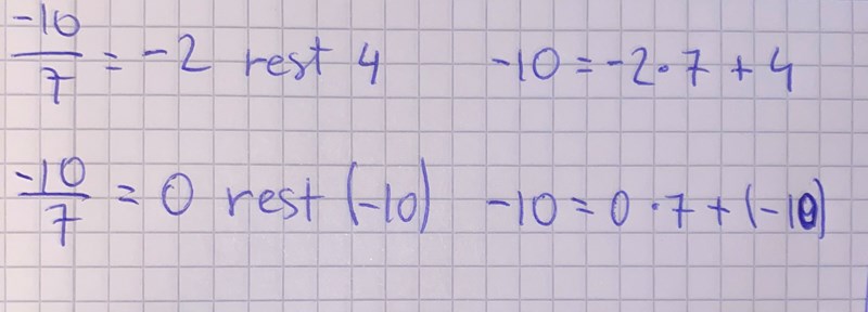 Jag håller med, jag tycker att (-10) kan inte vara en rest vid division medan 7, det är bara 0,1,2,3,4,5,6 som kan vara en rest vid division med 7 (tror jag) ! Men jag vet inte om kvoten kan vara -1 för att -1 • 7 = -7 och -7 > -10 så det skulle inte finnas nåt rest, eller?