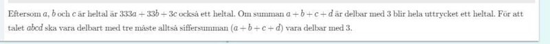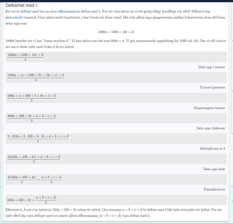 är redan ett heltal, alltså krävs bara att går jämnt upp för att hela talet ska vara delbart med tre. Om går jämnt upp betyder det att är delbart med tre, alltså krävs att siffersumman () är delbar med tre för att hela talet ska vara delbart med tre.