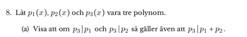 Hej, undrar om jag kan få lite hjälp med denna. Vet inte riktigt hur jag ska börja. Har försökt hitta på egna polynom till p1 p2 och p3 men verkar inte gå riktigt vidare