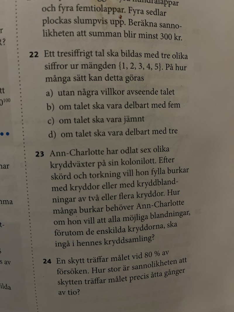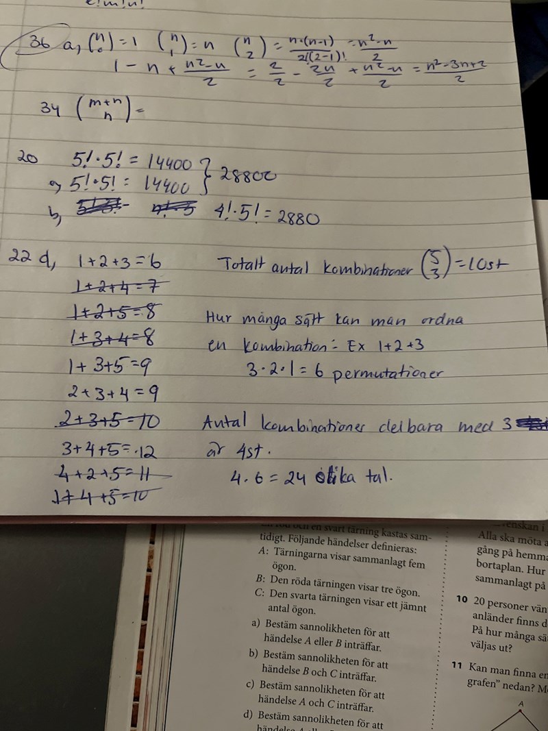Hej, jag har kommit fram till 23 sätt på 22d men det ska vara 24. Har säkert tänkt jättekrångligt men så här tänkte jag