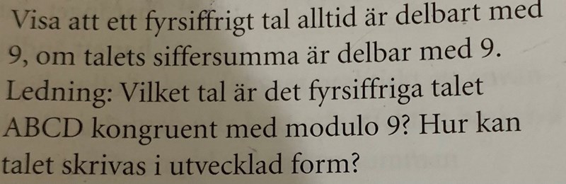 Du ska visa att ABCD är delbart med 9 givet att A+B+C+D är delbart med 9.