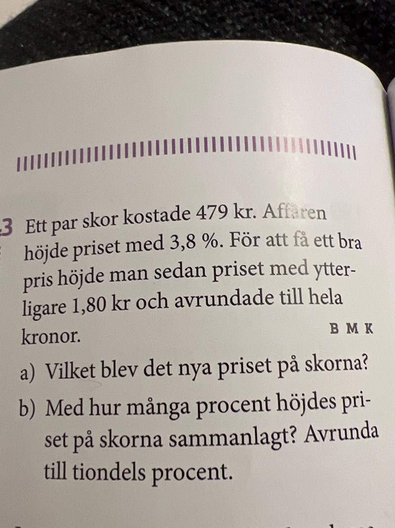 Ta skornas nya pris minus det gamla. Dela sedan differensen (svaret du fick) med 479 (skornas gamla värde). Du har nu fått svaret i decimalform. För att få det i procentform behöver du multiplicera det med 100.