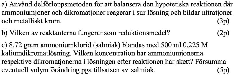 Rätt, men var oxideras respektive reduceras de till? Dvs vilka produkter? När du har svarat på det så har du grunden för de två delförloppen. Sen gäller det att ta reda på i hur många steg respektive ämne oxideras och reduceras. För att ta reda på det måste du först ta reda på oxidationstalen.