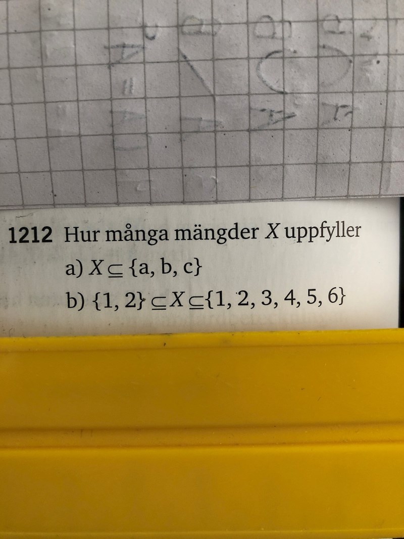 Om X är en delmängd av mängden {a,b,c} så betyder det att alla element som finns i X finns också i {a,b,c}. Det betyder också att det kan finnas fler element i mängden X så det ät inte säkert att det ENDAST finns 3 element i X. Varför skriver man ändå att n= 3 trots att det kan vara fler?Nej, om X innehåller andra element än {a,b,c} så är inte X en delmängd av {a,b,c}.
