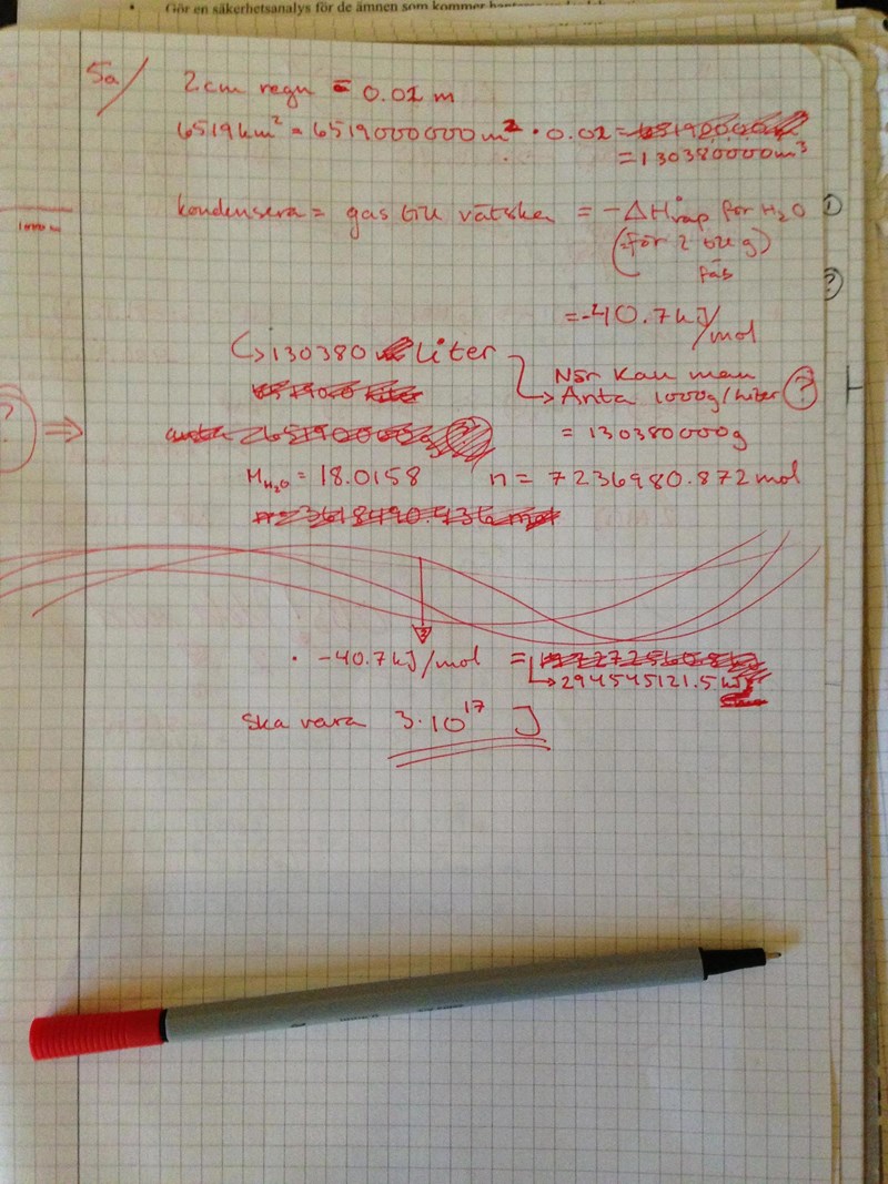 Man ska beräkna mängden energi som avges när vattnet kondenseras, mao går från gas till vätskefas, i molnen. Vattenmängden är den som kommer regna ner och ge ett 2cm tjockt lager vatten över 6519km^2