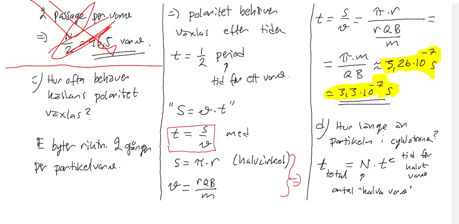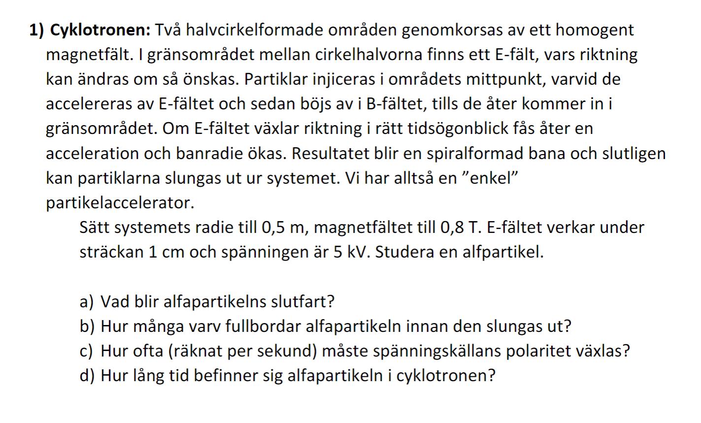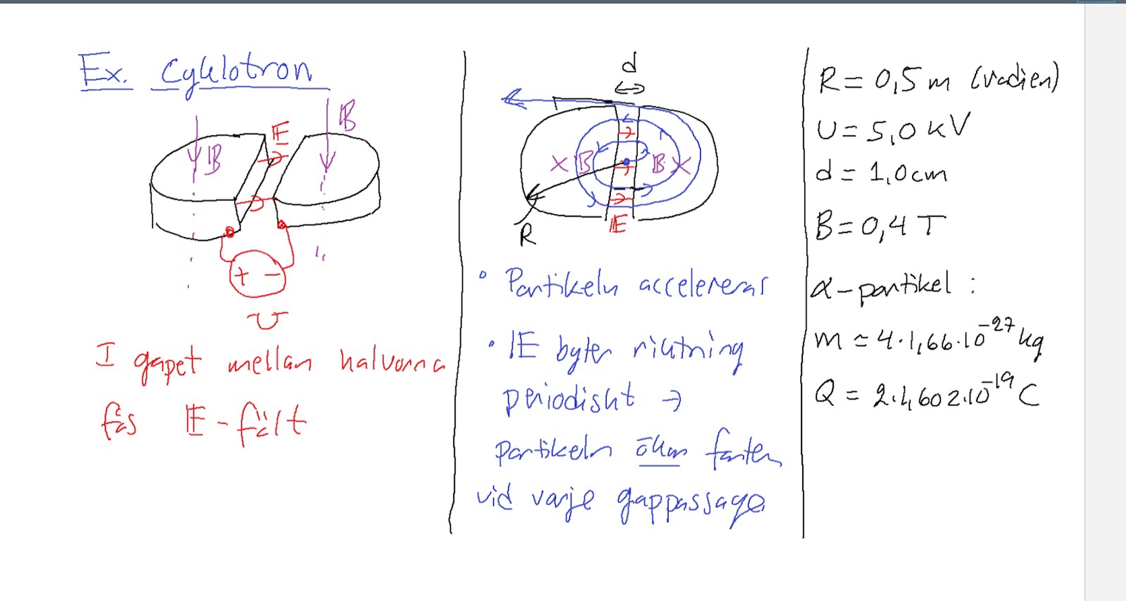 Cyklotronfrekvensen för en alfa-partikel i 0,4 T är 3,07 MHz, perioden är 0,326 mikrosekund.