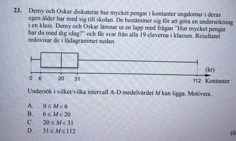 Ett annat sĂ€tt att formulera det du skrivit upp Ă€r att om vi sorterar alla elever efter hur mycket kontanter de har, sĂ„ har elev 1 (minsta vĂ€rdet) 0 kr, elev 10 (medianen) 20 kr, elev 5 & 6 i genomsnitt (undre kvartil) 6 kr och elev 14 & 15 i genomsnitt (övre kvartil) 31 kr. Ăvriga elever kan lĂ€gga sig var som helst i respektive intervall. Om alla elever som du kan vĂ€lja fritt för har sĂ„ lite som möjligt, vad blir medelvĂ€rdet dĂ„? Om alla har sĂ„ mycket som möjligt?