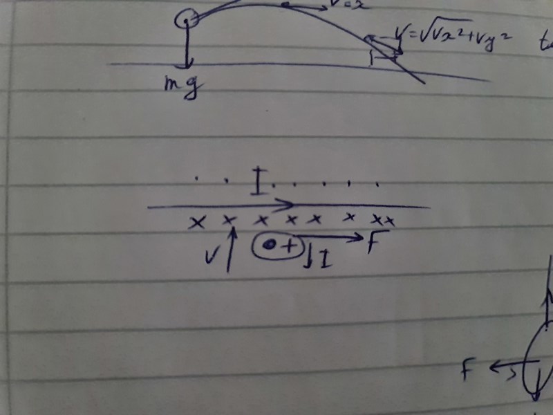 den är ett positivt laddad, då strömmen går mot hastighet riktning, och med högerhandsregel med flödestathet neråt, då blir riktning på kraften till höger, eller ?