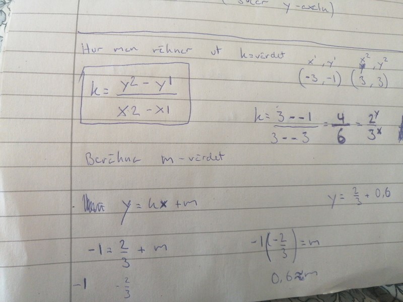 Broblemet är att när jag jag räknar ut k=värdet blir det 2/3. Sen räknar jag ut m-värdet så blir resultatet 0,666... Och då stämmer inte mitt första svar på m=1.vad är det jag gör för fel.?