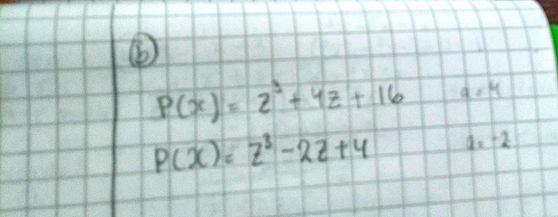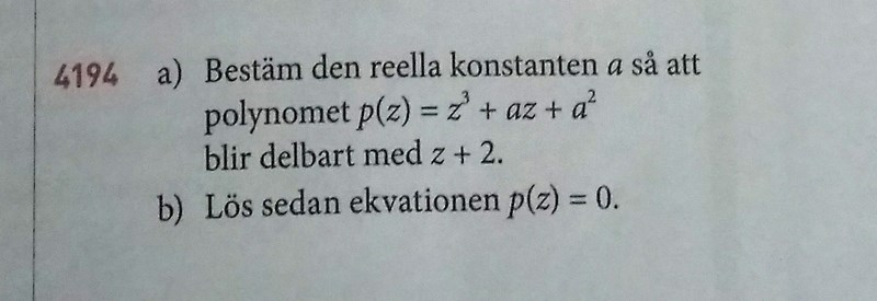 Jag behöver hjälp med fråga b. Jag förstår att det som söks är de andra rötterna möjligtvis de med imaginär del. Mina metoder för att hitta rötterna var 1. studera grafen men det gick inget vidare, den andra metoden var genom polynomdivision men då blir någonting fel när jag dubbelkollar svaret.