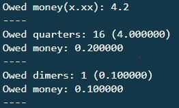 printf("Owed quarters: %i (%f)\n", howManyQuarters, quarters);