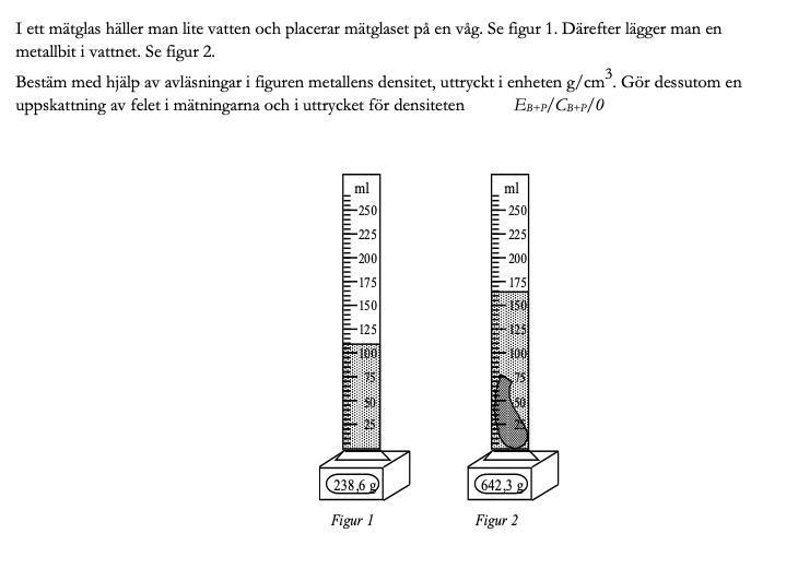 Såhär har jag räknat 642,3-238,6g=403,7g Metallen väger alltså 403,7g sen vet jag att man ska lägga i formeln p=m/v men nu förstår jag inte hur jag ska fortsätta ska jag alltså göra om 110 ml till volym eller hur ska jag fortsätta?