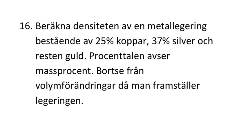 Volymen för legeringen är lika med summan av volymen för silvret + volymen för kopparn + volymen för guldet. Det står ju att man skall "bortse från volymförändringar då man framställer legeringen".