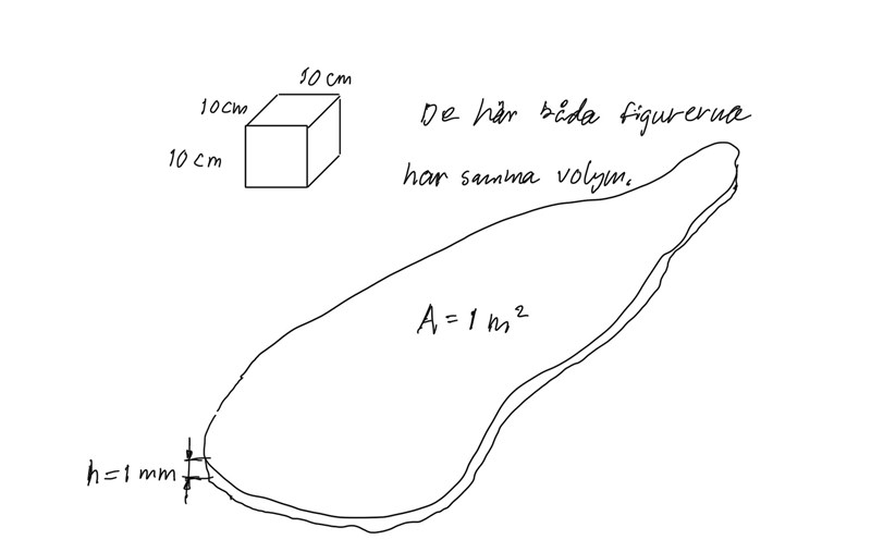 Jan Ragnar skrev:Beräkna först hur stor volym 1kg olja utgör. Därpå kan du dividera volymen med tjockleken på oljeskiktet för att få fram ytan.