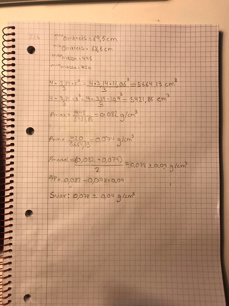 4 * 3.14 x 11.06^3/3 =5664.13 cm^3Nu dividerar jag massan/volymen = 445g/5664.13 = 0.078564 g/cm^3