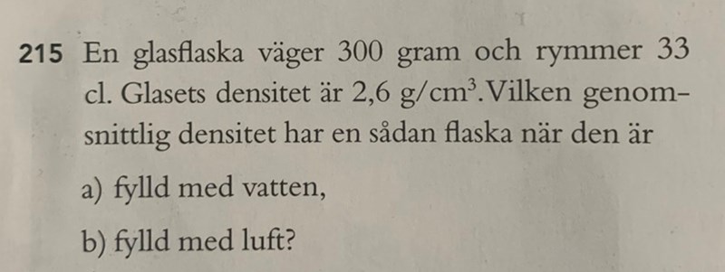 a) Vilken massa har själva flaskan? (Det står i uppgiften.) Vilken volym har själva flaskan? (Det kan du beräkna eftersom du vet flaskans massa och densiteten för glaset.) Luften i flaskan väger nästan ingenting, så massan för flaska+luft är ungefär lika med massan för själva flaskan. Medeldensiteten för den tomma flaskan är 300g/(33 cl + själva glasflaskans volym). Medeldensiteten är inte 0,9.