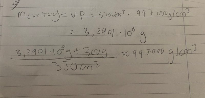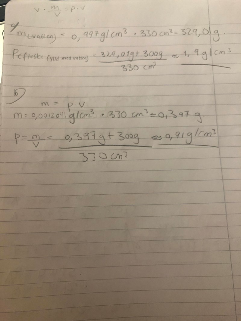 A) Flaskans massa är 300g . Vattnets massa beräknar jag genom att ta p*v=m . Där p  för vattnet är 0.997g/cm3 och v=330cm3. Detta ger oss en massa på 329g.