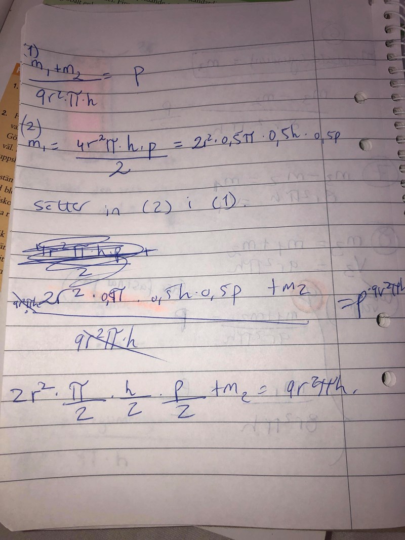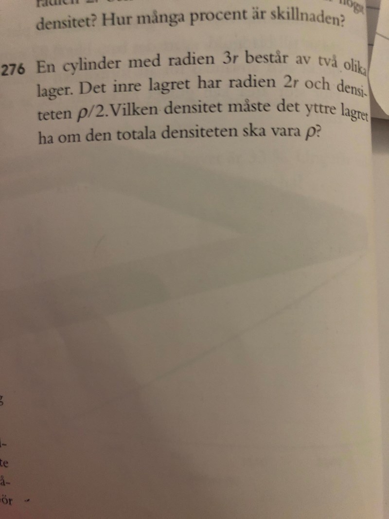 Jaha då förstår jag. Det är ju massan delat på volymen. Man ska alltså ta skillnaden i volymen inte i radien. Men jag förstår fortfarande inte varför det blir fel om man tar stor radie - inre radien för cylindern = yttre figurens radie? Därefter kan man använda sig av den radien för att beräkna volymen. Men det här sättet är ju förstås fel. Hittar däremot ingen logisk förklaring till varför