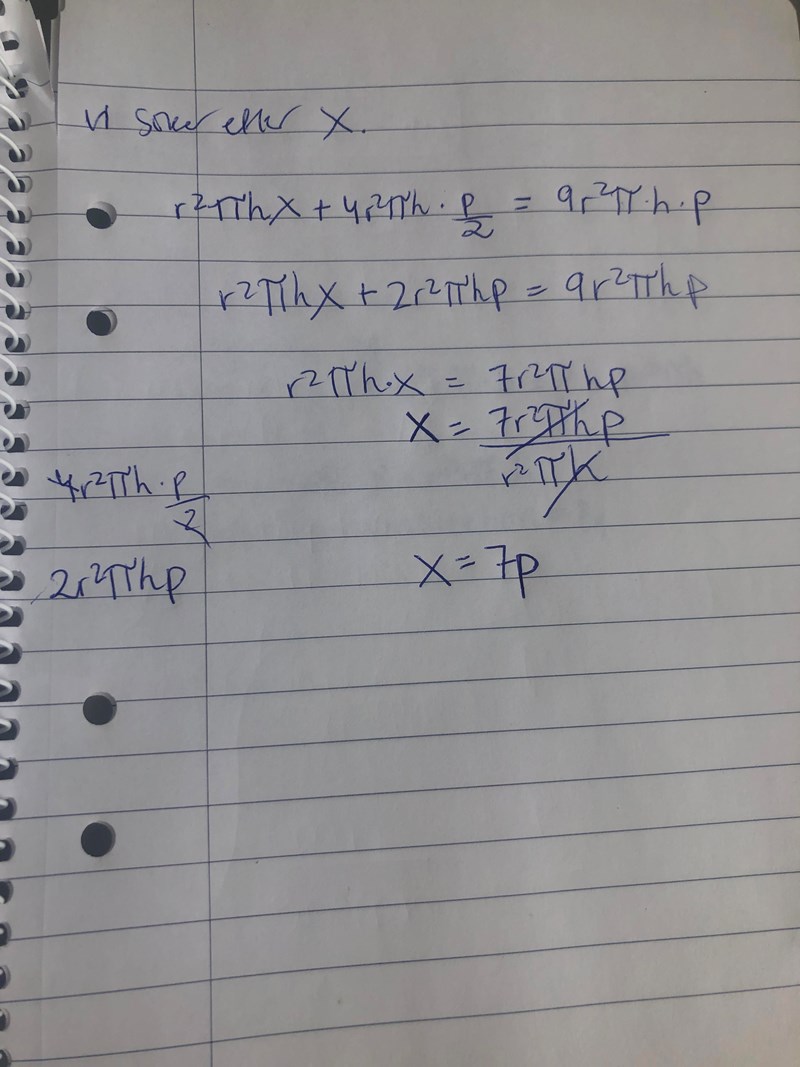 Den totala radien för hela cylindern är 3r. Den inre cylindern har radien 2r. I detta fall ska man ta 3r - 2r (för att hitta radien av den yttre cylindern. Vi får det till”r”dvs radien på den yttre cylindern. Då blir volymen r^2 * pi *h för den yttre cylindern. Men allt detta tankesätt är fel. Hur ska jag istället tänka för att hitta radien på den yttre cylindern?