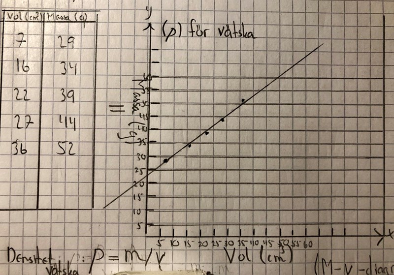 AHAAAAAAA JUUUUST DET!!! Tusen tack för hjälpen SvanteR. Jag satt bara vid mitt skrivbord och min hjärna var som frusen... Givetvis väger bägaren som vätskan låg i också någonting. Jag kan inte ta med den andelen massa i min densitetberäkning. Så fort jag avläste där grafen skär y-axeln så fick jag svaret på min densitetberäkning till 0,76 g/cm^3 som avrundas till 0,8 g/cm^3.
