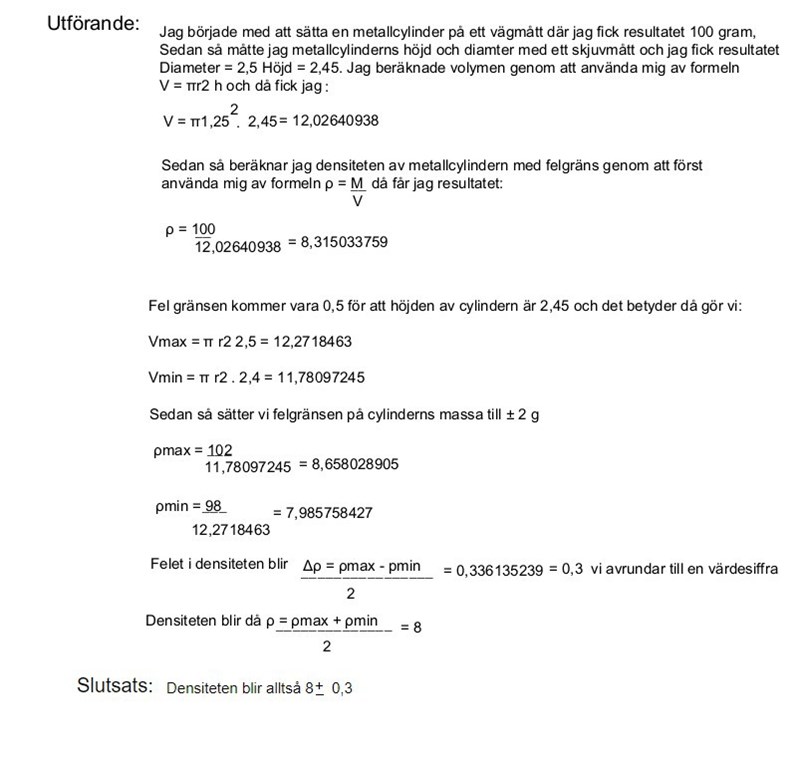Och gällande slutsatsen så har du missat att skriva ut enheten i svaret. Densiteten blir alltså [siffror].... vad? Även det kanske känns petigt då det ter sig relativt uppenbart vad det handlar om -- men återigen; det är en viktig sak att komma ihåg när man skriver fysik.