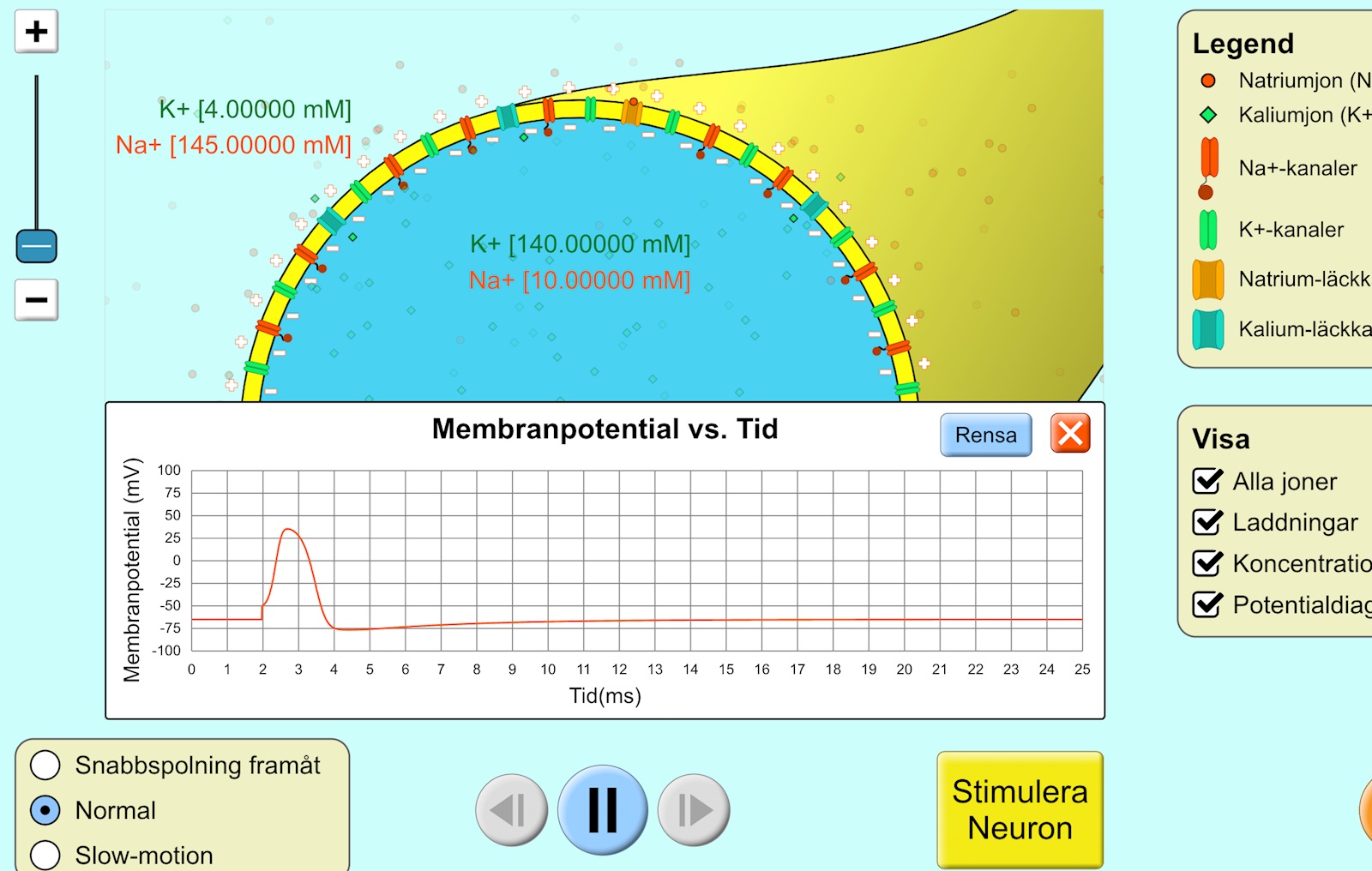Aktionspotentialen uppstår i samband med att bl.a. natriumjoner strömmar in i cellen, samt att kaliumjoner strömmar ut ur cellen - bägge genom sina egna typer av jonkanaler. Det kan kännas lite invecklat i början, men det är flera saker som tillsammans gör att nervceller kan skicka nervsignaler från dendriter till axonens ände. Kanske enklast att ta dessa delar en i taget, tills du får en bild av helheten.
