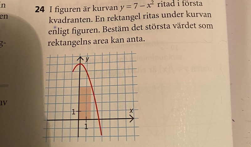 Sånna här är lite knepiga. Du är säkert van med att hitta en funktions största värde? T.ex. "hitta största värdet till f(x) = 7-x^2". Men nu är det lite svårare än så, det är nämligen en rektangel under funktionen. En area... det brukar man tänka som basen*höjden eller hur? Kan du beskriva basen och höjden med hjälp av x och y (använd att y = 7-x^2)