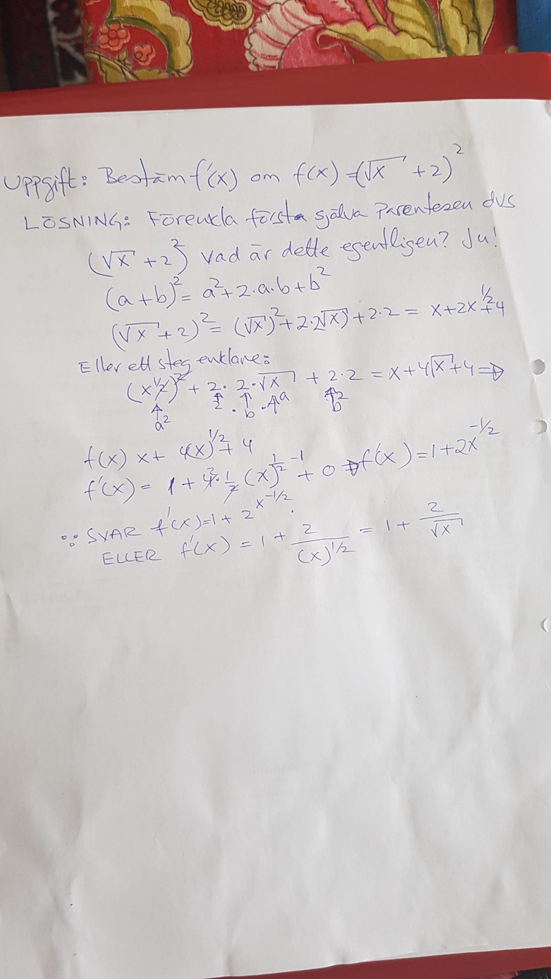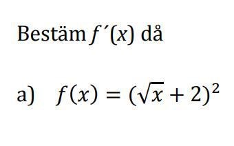 Varje gång jag deriverar får jag fel svar (2/roten ur x ), har testat med allt, kvadreringregler, skriva om osv.
