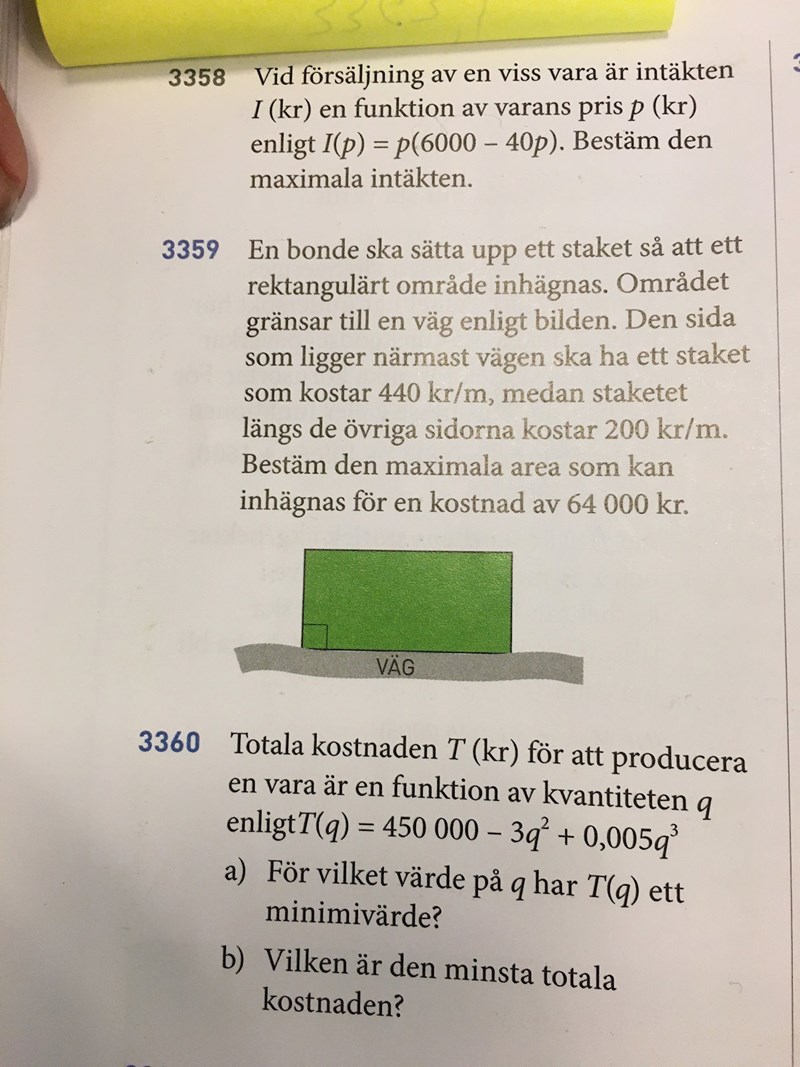 Staketet längs vägen kostar 440 kr per meter, och jag antar att de menar att de resterande sidorna var och en kostar 200 kr per meter. Detta är ett optimeringsproblem där vi först vill ställa upp en funktion som i det här fallet bör vara kostnad som en funktion av meter, dvs kostnaden beror ju på hur många meter staketet är, typ