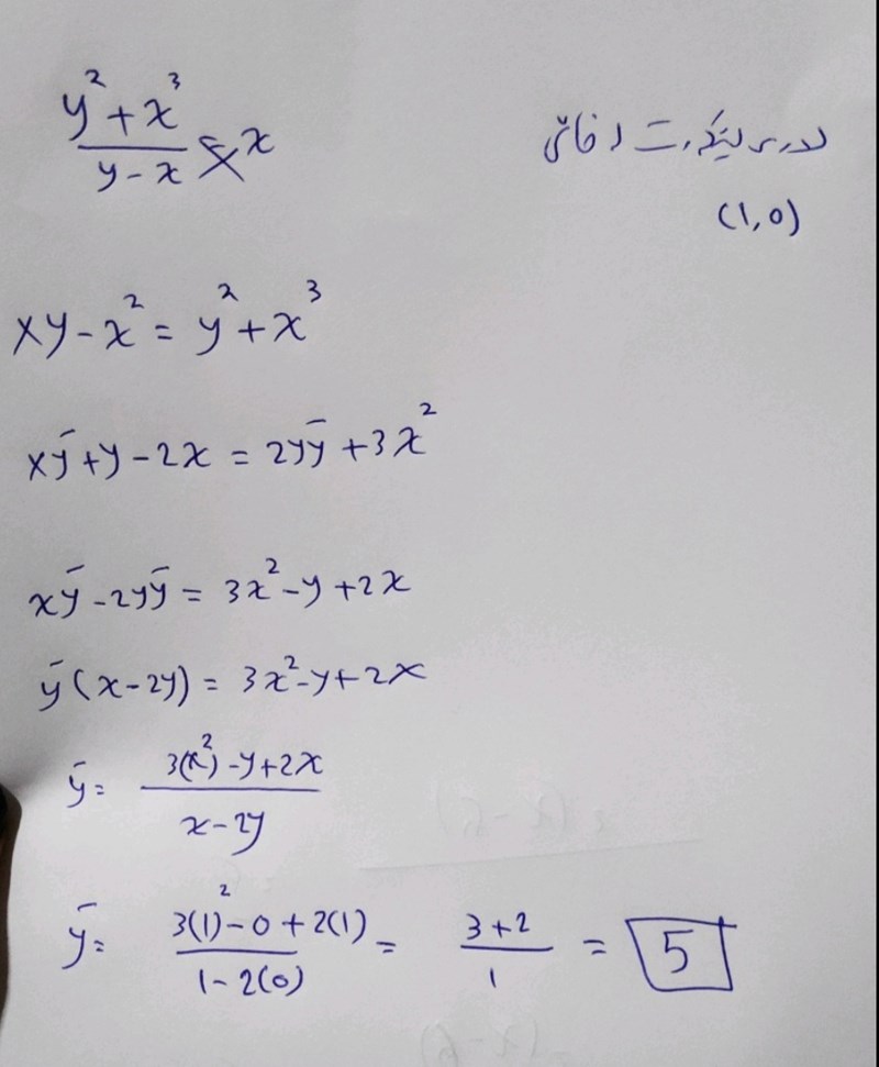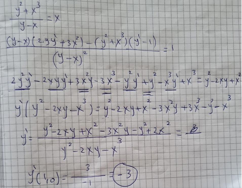 y2+x3y-x=xxy-x2=y2+x3xy'+y-2x=2yy'+3x2xy'-2yy'= 3x2-y+2xy'(x-2y)= 3x2-y+2xy'=3x2-y+2x(x-2y)derviera i punkten (1,0)y'=51=5men jag har tänkt att göra på ett annat sätty2+x3y-x=xdy2+x3y-xdx=dxdx(y-x)(2yy'+3x)-(y2+x3)(y'-1)(y-x)2=1resultatet blir -3
