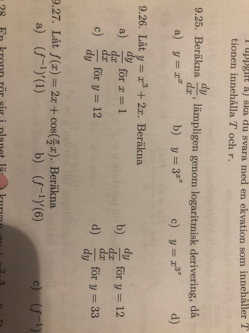 På den andra uppgiften ska man betrakta x som funktion av y. Du kan sätta x=f(y) dvs y=(f(y)) 3 +2f(y) och derivera med avseende på y. Glöm inte inre derivatan av f. Det är den som gör att du kan lösa ut df(y)/dy dvs dx/dy.