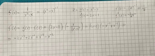 Smaragdalena skrev:Då skulle jag skriva funktionen som f(x) = (x2-x)-1 och använda kedjeregeln.