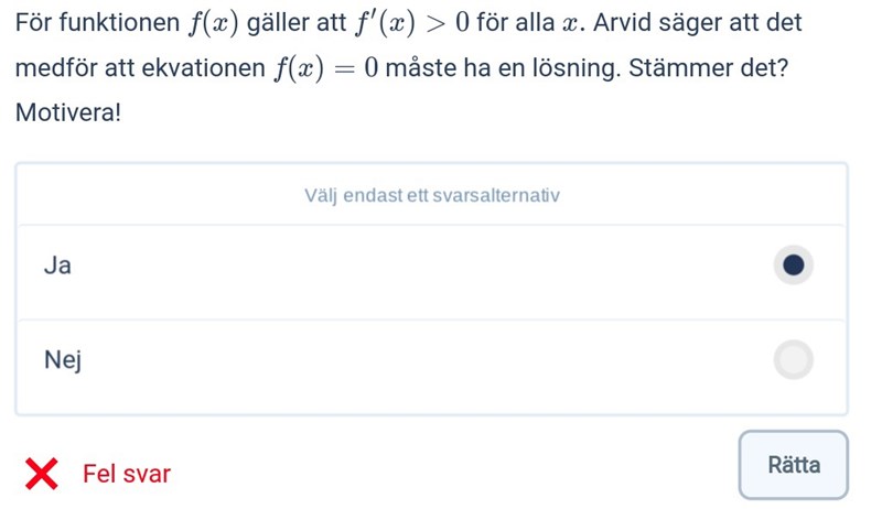 Förstår inte varför jag får fel. Jag tänker att f(x) måste vara en rät linje och har därför bara en punkt där y=0