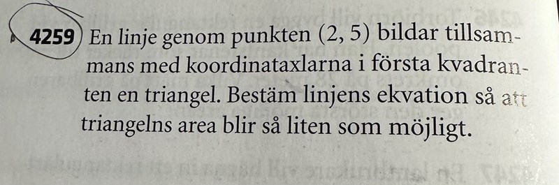 Jag hade börjat med att skriva linjens ekvation som , sätta in vad vi vet (att den går genom ), och utifrån det ta fram skärningspunkterna med koordinataxlarna. Det kommer ge dig ett uttryck för arean.