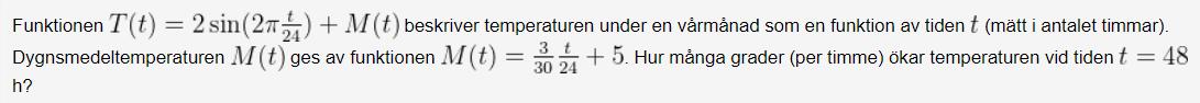 Yngve skrev:nuitlbd skrev:men får jag fråga hur du får derivatan till att det blir T’ = 2 cos(2pi t/24) * 2pi/24 + 3/(30*24)?jag tänkte att det skulle bli T’ = 2 cos(2pi t/24) * 1/24 + 1/24. men det kanske är för att det är multiplicerat som du fått det så?